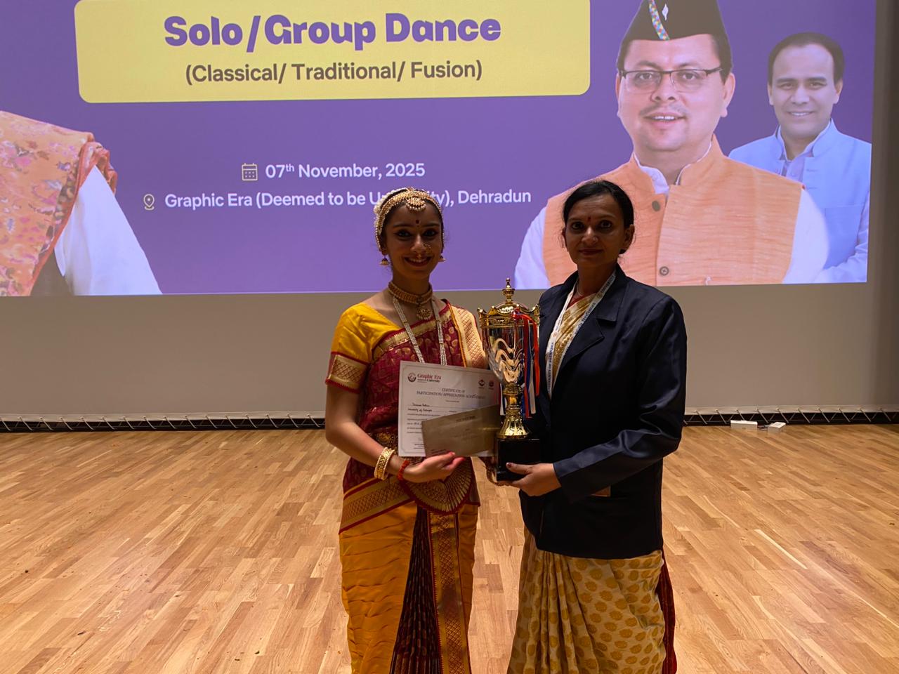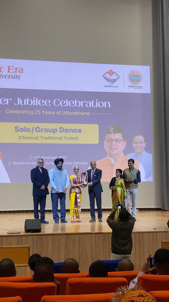 7 नवम्बर 2025 को आयोजित राज्य स्तरीय नृत्य प्रतियोगिताओं के अंतर्गत विश्वविद्यालय की छात्रा यशस्वी ठाकुर ने एकल शास्त्रीय नृत्य (सोलो क्लासिकल डांस) प्रतियोगिता में द्वितीय स्थान प्राप्त किया। उनकी यह उपलब्धि विश्वविद्यालय की समृद्ध सांस्कृतिक परंपरा, नृत्य-कौशल तथा योग-संस्कार-आधारित शिक्षा प्रणाली की प्रभावशीलता का उज्ज्वल उदाहरण प्रस्तुत करती है।