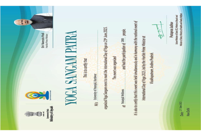 11वें अंतर्राष्ट्रीय योग दिवस के अवसर पर पतंजलि विश्वविद्यालय में योगाभ्यास कार्यक्रम एवं हरित योग वृक्षारोपण कार्यक्रम के अन्तर्गत सभी प्राध्यापकों एवं छात्र-छात्राओं द्वारा 600 से अधिक फलदार, छायादार पौधे लगाये गये।