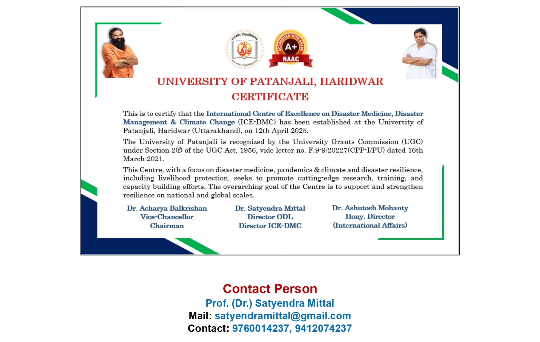 Applications are invited for Interdisciplinary Ph.D programmes at the International Centre of Excellence on Climate Change, Disaster Medicine, and Disaster Management in the field of Yoga, Allied & Applied Science, Environmental Science, Sanskrit, Philosophy, Spiritual Studies and allied subjects. Eligibility condition, fee etc shall be the same as prescribed by University of Patanjali.